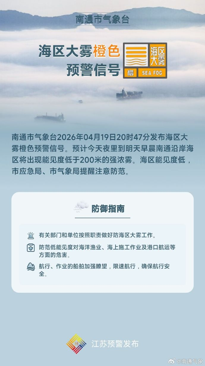 南通市气象台2026年04月19日20时47分发布海区大雾橙色预警信号。预计今天夜里到明天早晨南通沿岸海区将出现能见度低于200米的强浓雾。海区能见度低,市应急局、市气象局提醒注意防范。