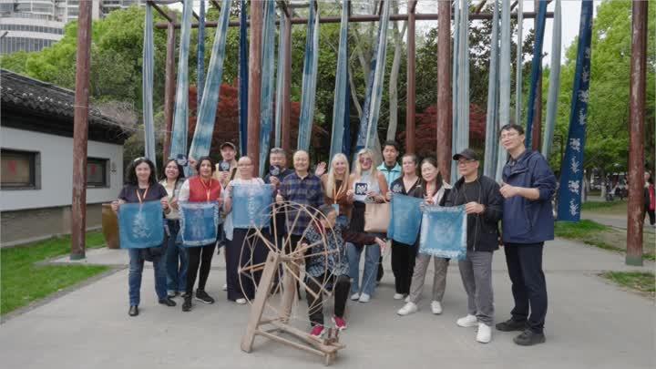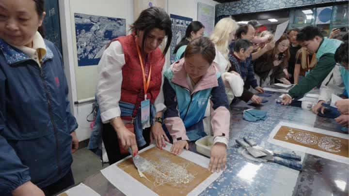 在南通蓝印花布博物馆,考察团成员在非遗传承人手把手指导下,沉浸式体验学习刻版、刮浆、浸染等蓝印花布制作工序。当蓝白图案在布面上徐徐绽放,一位“老外”博主感动地说:“这种蓝白之美不需要翻译,它天然契合当下全球对传统文化和手工艺复兴的追求。”