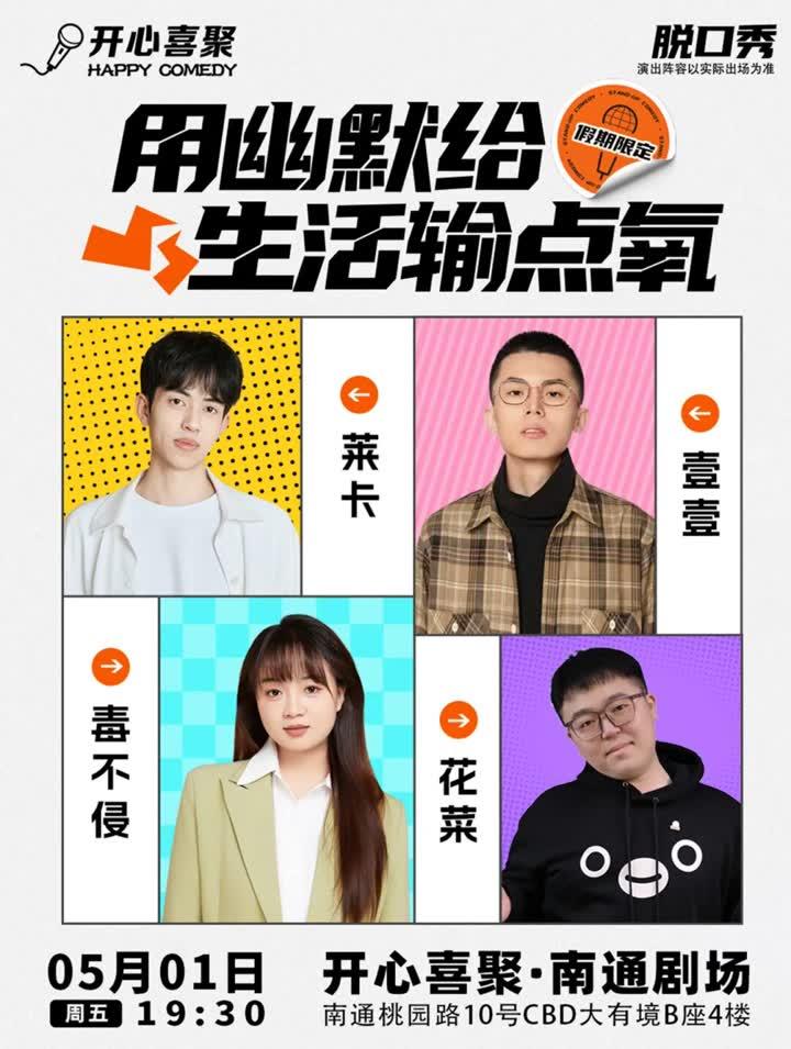 开心喜聚·五一限定,精品脱口秀,自媒体博主——壹壹,一米五黑社会——毒不侵,颜值与实力并存演员——莱卡,脱口秀界劳模代表——花菜,周末假期 爆笑不停。