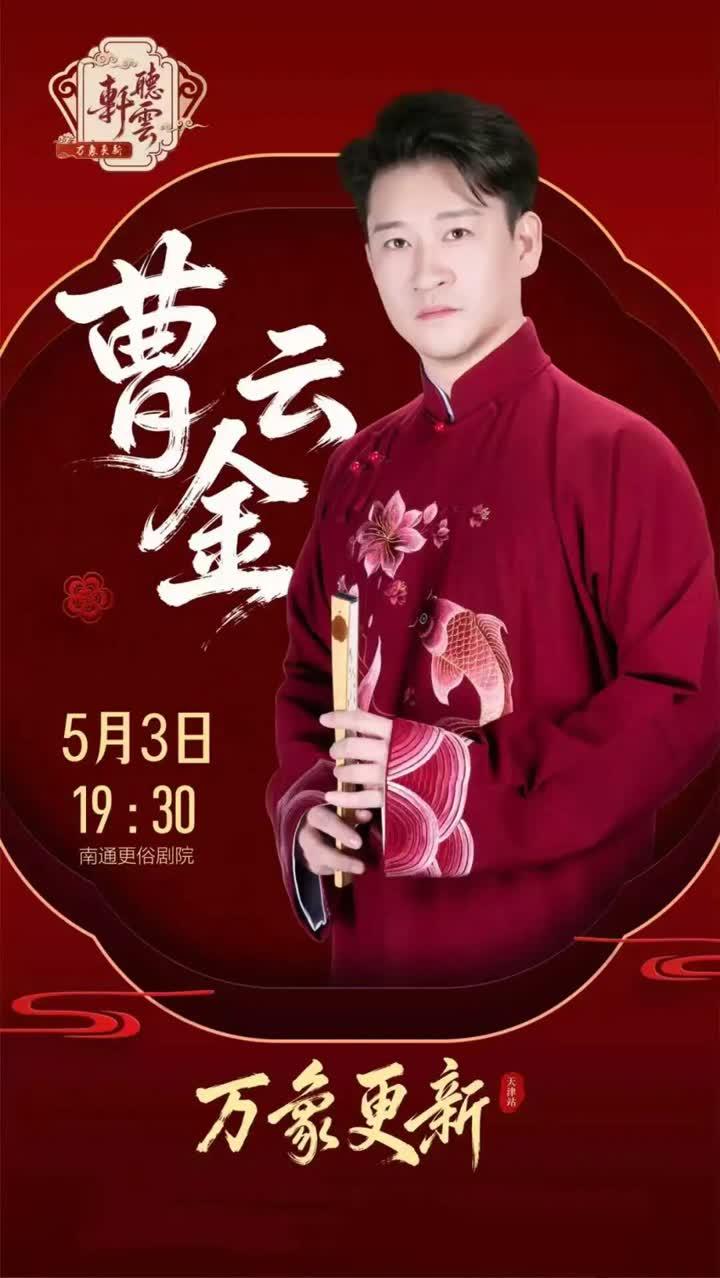 五一假期,带上父母、牵上孩子,来南通更俗剧院,在笑声中度过一个轻松惬意的文化假期。5月3日,著名相声演员曹云金将携听云轩带来“万象更新”2026全国巡演南通站。传统段子与新潮热梗交织,让您在捧腹大笑中感受曲艺魅力。