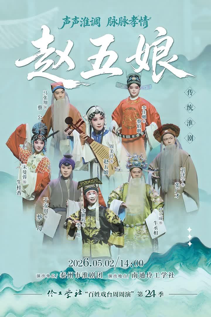 5月2日,伶工学社“百姓戏台周周演”特邀泰州淮剧团演出经典淮剧《赵五娘》。该剧剧情朴实动人,唱腔婉转醇厚,充分展现淮剧艺术特色与优秀传统文化内涵。此次惠民演出免费向市民开放,通过现场领票、电话预约等方式入场。