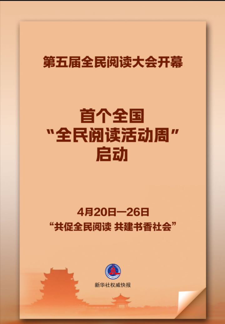 为扩大全民阅读辐射面和影响力,营造爱读书、读好书、善读书的浓厚氛围,扎实推进书香社会建设,第五届全民阅读大会4月20日在江西南昌开幕,首个全国“全民阅读活动周”启动。