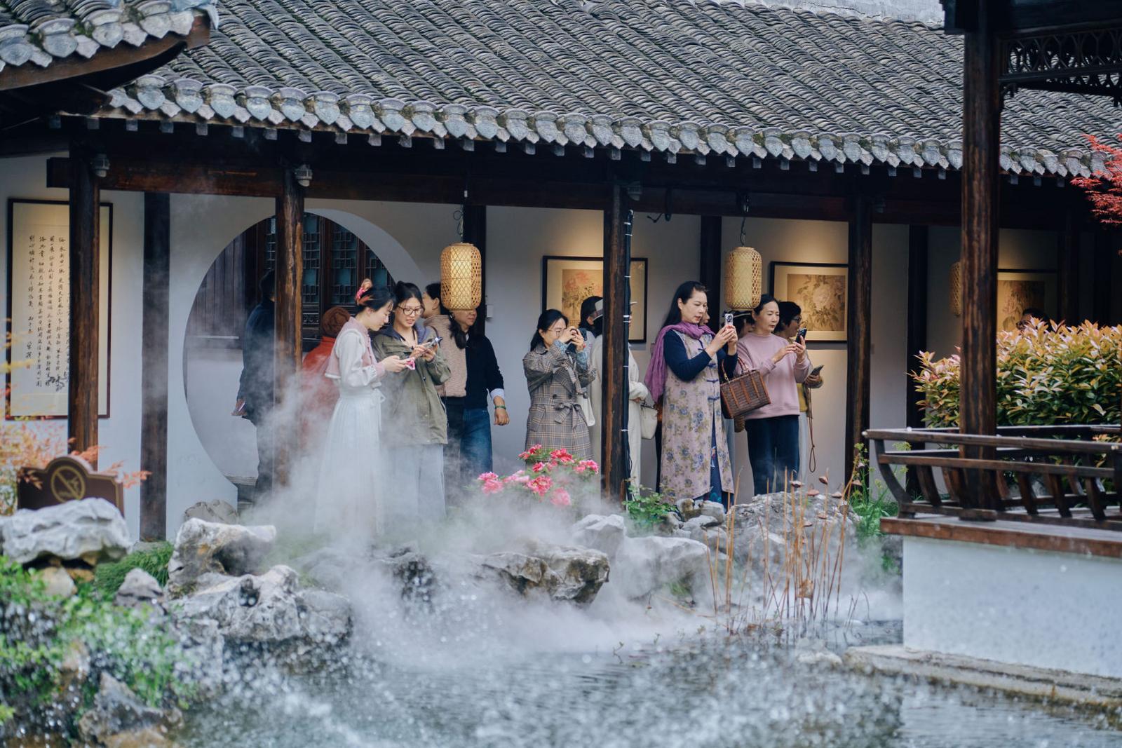 随后,涉园内依次上演四重雅事,为观众呈现一场全方位的美学盛宴:亭台水榭之间,古琴名家轻拨琴弦,《流水》的空灵、《牡丹亭》的婉转缓缓流淌;临水而设的牡丹主题茶席,茶香袅袅,宾客围坐品茗,在清茗氤氲中感受春日闲情;戏曲老师身着雅致戏服,演绎《牡丹亭》经典片段,水磨调婉转悠扬,与牡丹的柔美相得益彰。