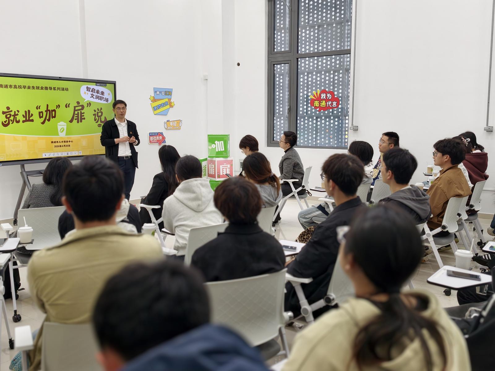 20日上午,南通大学大学生一站式服务社区内咖啡香袅袅,就业指导“咖”“扉”说文科类专场活动在此举行。来自通大文科类专业的近40名学生,与高校就业指导专家、企业人力资源负责人、优秀青年代表围坐一堂,就人工智能浪潮下文科生的机遇、挑战与成长路径,展开一场别开生面的对话。