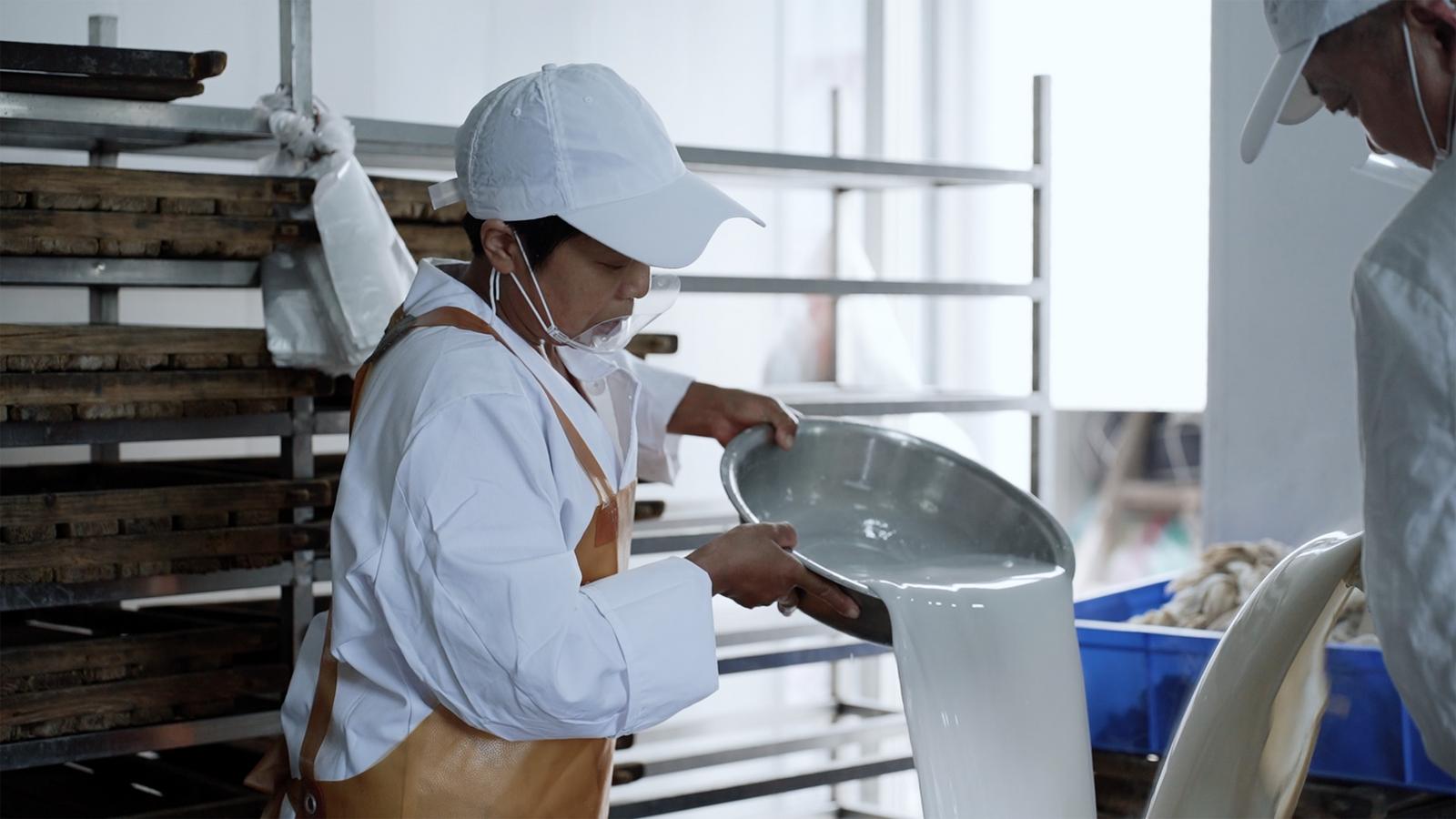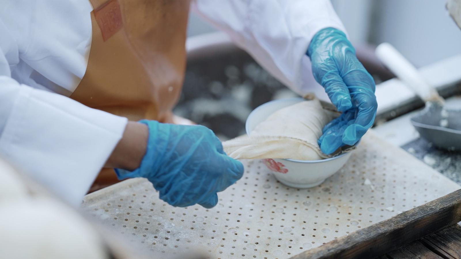 点卤是豆腐成型的关键,也是手艺的魂魄所在。沈小芳用的,是沈家秘制的卤水。卤水与豆浆的比例、混合的手法与时机,全凭代代相传的经验与掌心多年的记忆。“没有秤,也没有刻度,都在手上,在心里。”点卤后便静静等待,直到液态的豆浆冷却凝固成白嫩嫩的豆花。