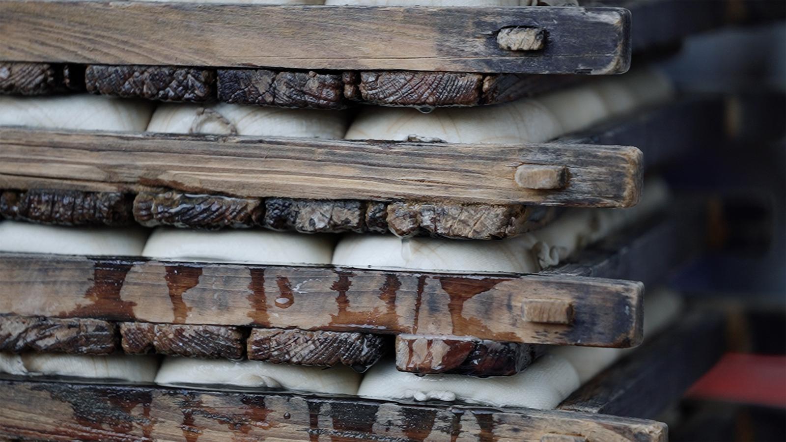 接着是包布、入模、成型。沈小芳的动作麻利而娴熟,舀豆花、裹纱布、填木框,一气呵成,行云流水。丈夫则默契地将一层层木框叠起,施以重压,多余的水分在缓慢的挤压下淅淅沥沥渗出,豆腐的筋骨与韧性便在这漫长的等待中悄然生成。