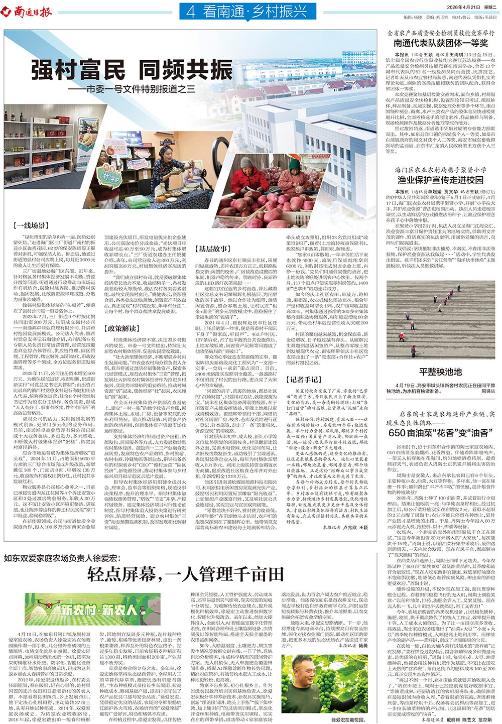 4月18日,在如东县河口镇龙坝村双爱家庭农场,农场负责人徐爱宏站在葡萄园操作着一部手机,几公里外柑橘园的土壤墒情、虫情变化就尽在掌握。徐爱宏轻点屏幕,远程启动智能水肥一体机,按需为果树精准补水补肥。数字化、智能化设备全面上岗,智慧农事高效运转,已成为这名返乡新农人春耕管护的日常标配。