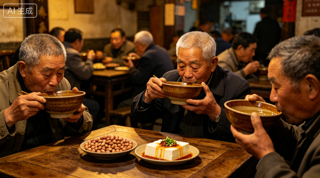 此间酒馆,本无半分体面可言。几张旧木桌漆皮斑驳,边角被岁月磨得温润圆润;长板凳坐出了透亮的包浆,人一落座,便轻响一声“咯吱”,似与时光低语。墙角随意堆着半袋新米,粗陶酒坛口封着洗得发白的粗布,空气里飘着淡淡的米酒酸酵味,混着酱油的咸鲜,丝丝缕缕,皆是家常。这般寒素的铺子,却凭着价廉的生存法则,在时光里扎了根。一顿早酒,开销从不过十文之数般低廉:一碗温米酒两块,一盘煮烂的蚕豆儿两块,一碟盐水花生两块,一碗阳春面两块……这微薄的花销,是对生计的温柔妥协,更是对底层生活最妥帖的包容,如古巷小肆般守着“市井长情,薄利生久”的朴素道理。