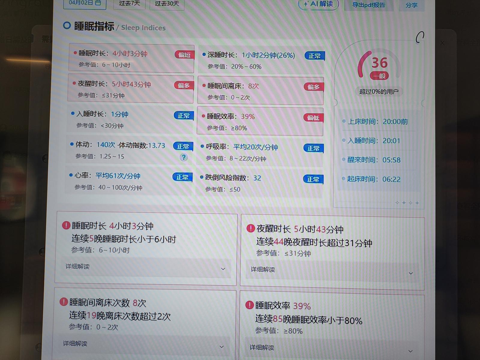 “夜里起夜几次、睡眠好不好,AI都会记录并生成图文报告,全是大白话解读,还会根据我的数据给出健康建议。”卫阿姨激动地展示着与监测仪联通的手机APP里的报告。更让她安心的是,一旦出现呼吸骤停、长时间离床未归等危险情况,后台的AI智能预警系统会在45秒内自动触发报警,同步通知她在上海的女儿、社区网格员和绎护联养老服务专员,实现“风险早发现、家人早知情、服务早上门”的智能防护闭环。