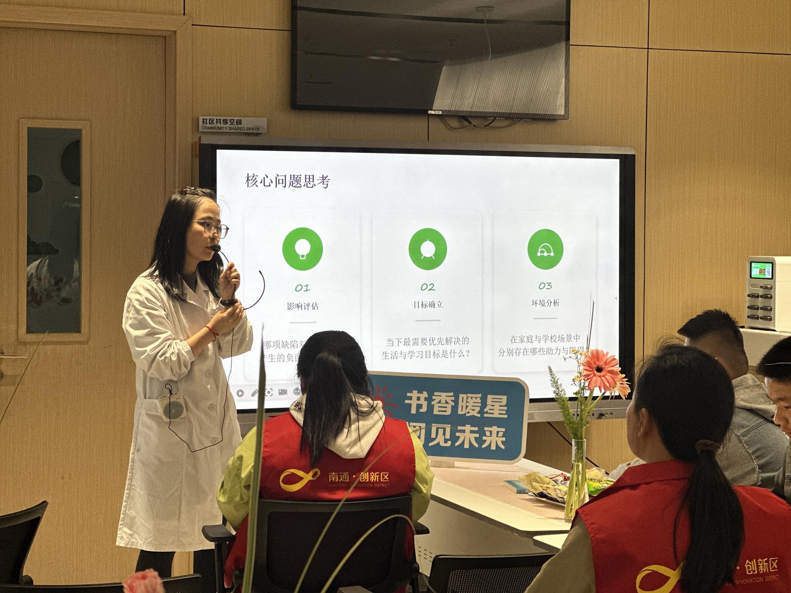 活动现场,南通市第一人民医院医生带来专题培训,围绕孤独症儿童核心特征、家庭干预原则及常见误区展开讲解,帮助家长建立科学照护认知。同时,医生结合日常场景,现场演示行为引导、情绪安抚等实操技巧,手把手指导家长应对孩子的情绪与行为问题。
