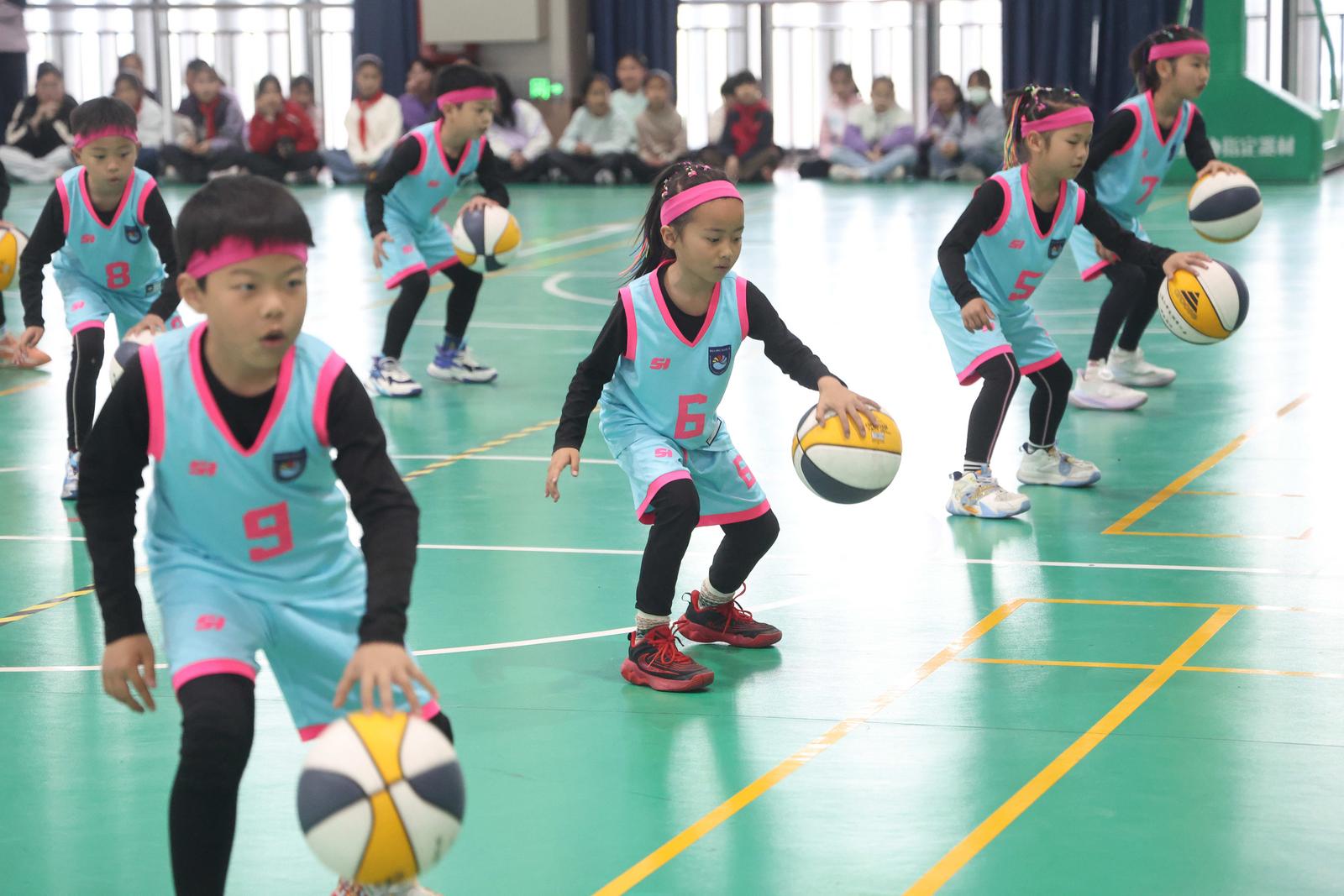 活动在热烈的氛围中拉开帷幕。学校篮球社团的小球员们身着统一服装,带来了篮球操表演。胯下运球、运球跑跳、队形变换……整齐的动作和娴熟的技巧,赢得阵阵掌声。随后,球员李承耀、闫实来到场地中央,带领孩子们进行动态热身。单脚连续跳、俯身跨步、弓步折返……手把手地帮助同学纠正动作,一丝不苟。教学指导环节,吴超、刘泽希等四名球员分别带领孩子们练习运动和投篮。“手腕要柔和,眼睛看球筐!”随着篮球应声入网,引来一阵阵惊呼。