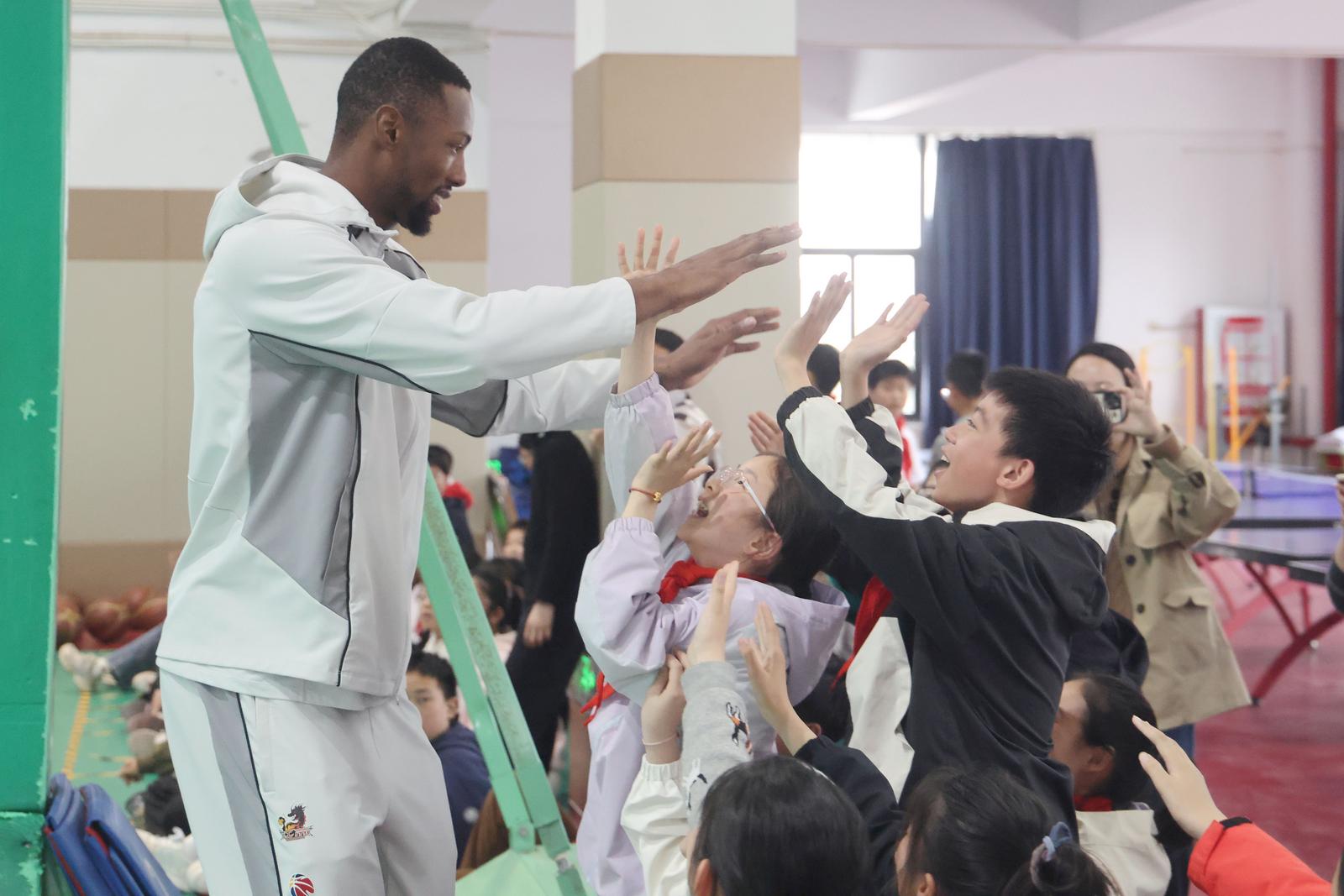 “我进了两个球,爽!”小球员李雨漫满头大汗,喘着气说,“我学打篮球两年多了。今天能和职业球员一起打球,虽然有点紧张,但特别开心!”