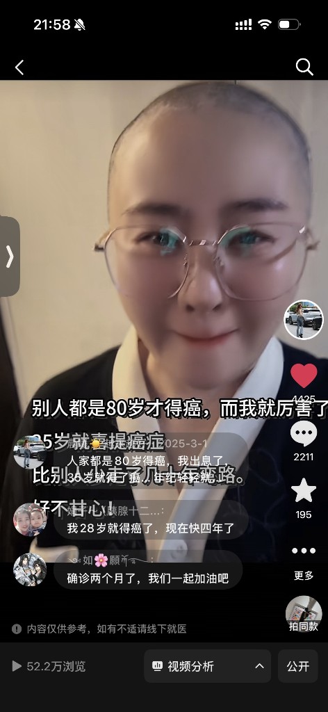“确诊时的恐惧,治疗中的痛苦,偶尔好转时的希望,复查前的焦虑……那段时间,情绪就像坐过山车,总是在绝望和希望之间反复拉扯。”与其困在负面情绪里自我消耗、胡思乱想,倒不如做点什么。于是,陈曦便开通了自己的抖音账号。2025年2月,她发布了第一条抗癌短视频。