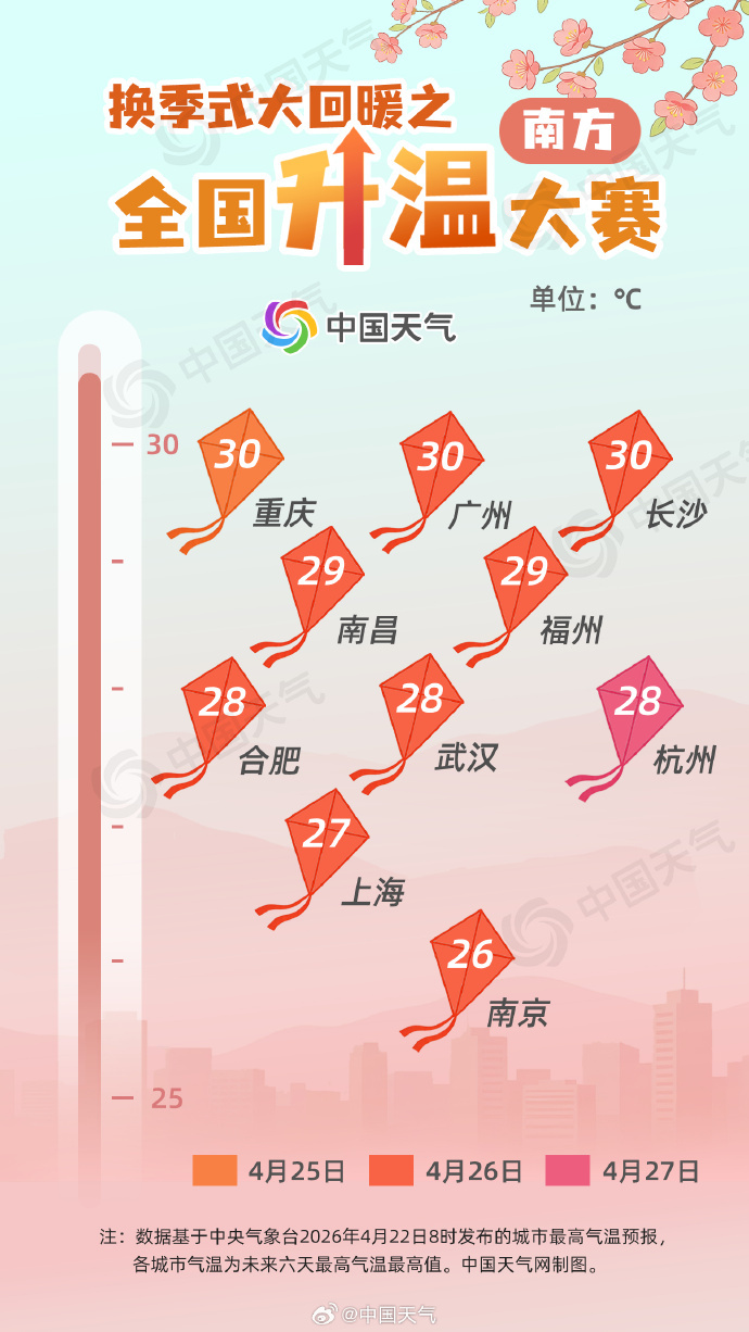 全国范围内也即将迎来大范围换季式大回暖,南北多地同步开启升温进程,周末前后华北至长江中下游一带暖热达到近期峰值,不少区域气温将冲击30℃,体感由春日湿冷直接切换至初夏暖意。前期冷空气叠加降雨,东北、长江中下游多地气温低迷湿凉,未来三四天全国自北向南陆续升温,多地升温幅度显著,季节转换感强烈。