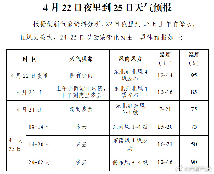 4月22日夜里到25日南通天气预报>>>