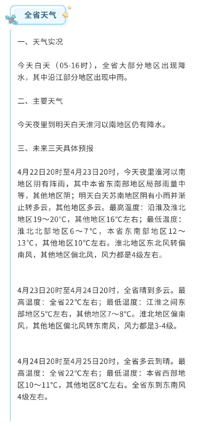 4月22日20时至4月23日20时,今天夜里淮河以南阴有阵雨,东南部局部雨量中等,其余地区阴天;明天白天苏南小雨渐止转多云,其他区域多云。沿淮及淮北最高气温19到20℃,省内其余地区16℃左右,淮北北部最低6至7℃,东南部12至13℃,其余各地10℃左右。淮北东北风转偏南风,其余区域偏北风,风力均在4级上下。