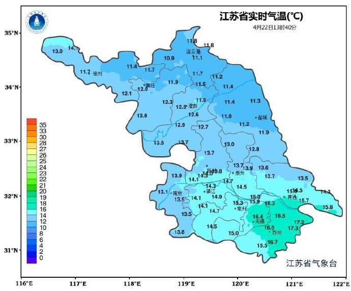 今天白天江苏全省大范围出现降雨天气,沿江一带多地迎来中雨,淮河以南区域雨水持续在线。受阴雨压制,省内气温明显偏低,午后2时实时气温显示,东南部区域大致在15℃上下,其余多数地区仅11至14℃,湿冷体感十分明显。