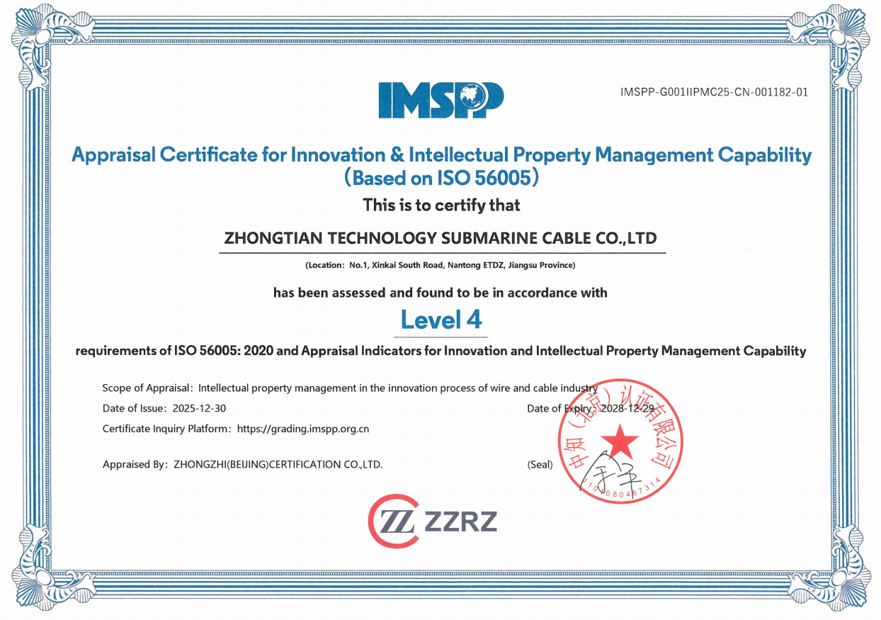 从“技术突围”到“体系赋能”,中天科技始终坚持用知识产权筑牢创新底座。去年12月,中天科技海缆股份有限公司通过创新与知识产权管理能力分级评价,成为全国线缆行业首家荣获 IS056005《创新与知识产权管理能力》4级证书的企业,这也标志着公司在创新与知识产权管理的系统化、国际化水平上取得关键突破。