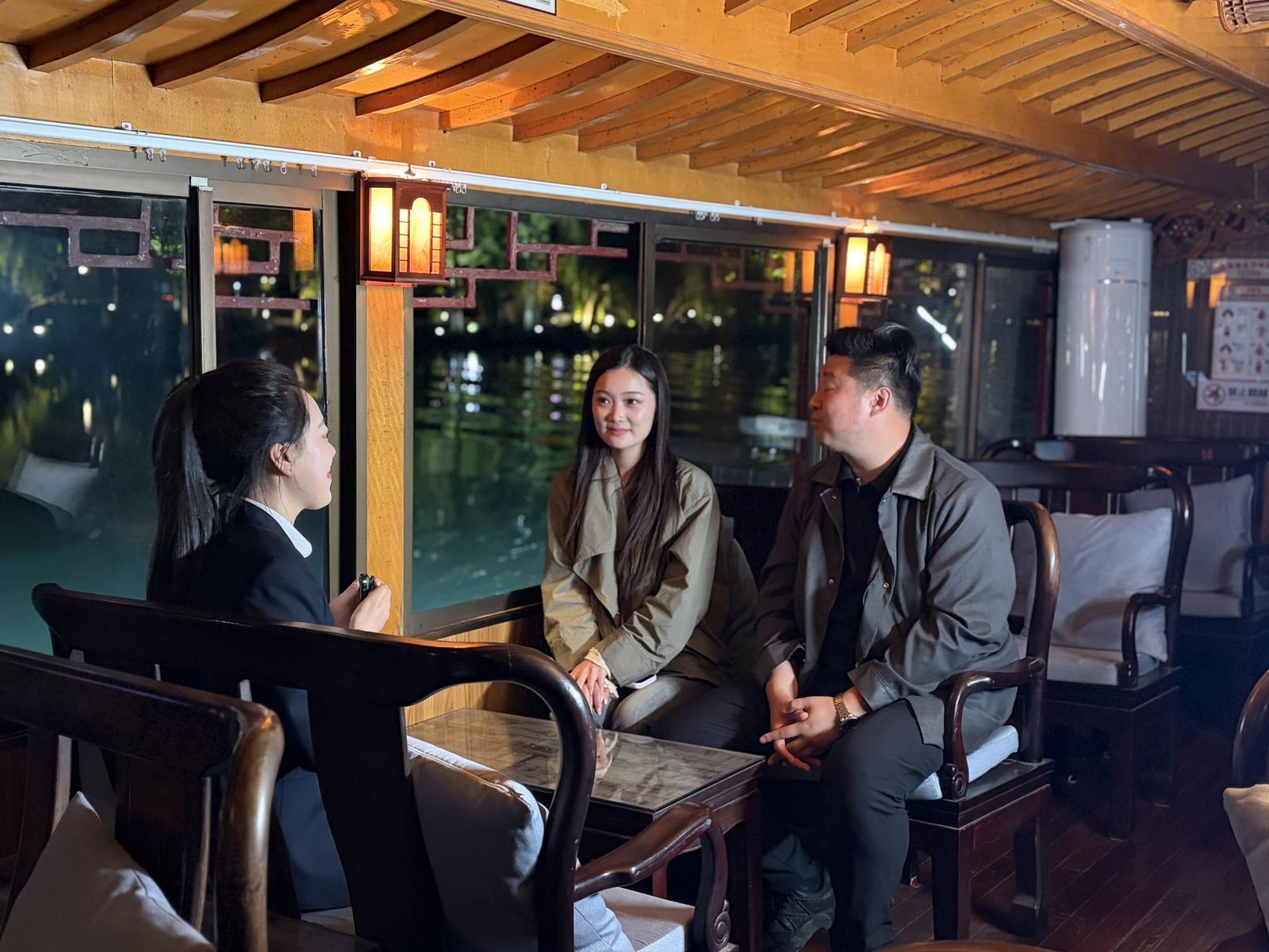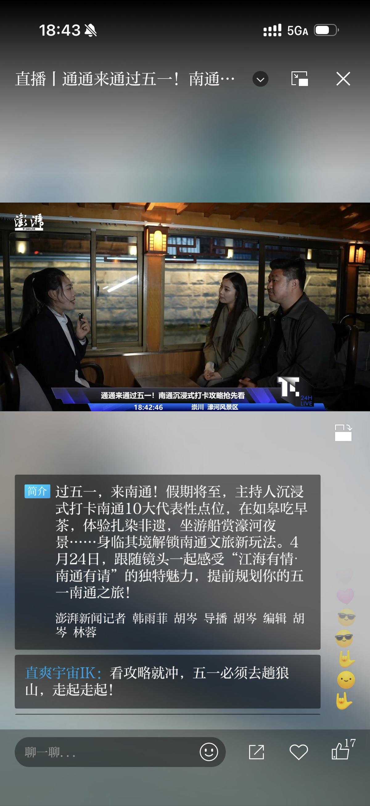 南通行的最后一站,主持人们选择乘船夜游濠河,通过“濠河夜画”沉浸式实景演绎项目,一睹5A级景区濠河的风采,更以全新视角揭开南通城的历史风云与人文故事。“在‘五一’假期,要想找一个老少皆宜、体验感强的目的地去旅行,南通是非常好的选择。这里既有年轻朋友喜爱的露营、美食,更有适合全家一起游玩的动物园、博物馆、游船等,下次我一定会带上我的家人朋友再来南通。”澎湃新闻主持人雨菲体验后有感而发。