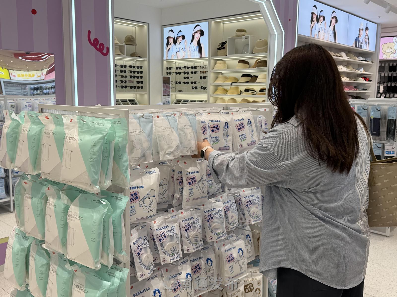 27日下午,在市区一家规模较大的名创优品门店,记者看到不同种类、功能各异的出游好物集中摆放在显眼位置。从一次性浴巾、日抛袜子、次抛马桶垫,到便携分装瓶、U形枕、折叠水杯、遮阳帽等,应有尽有。这些主打轻便、小巧、实用的旅行好物,几乎都能“一站式购齐”。