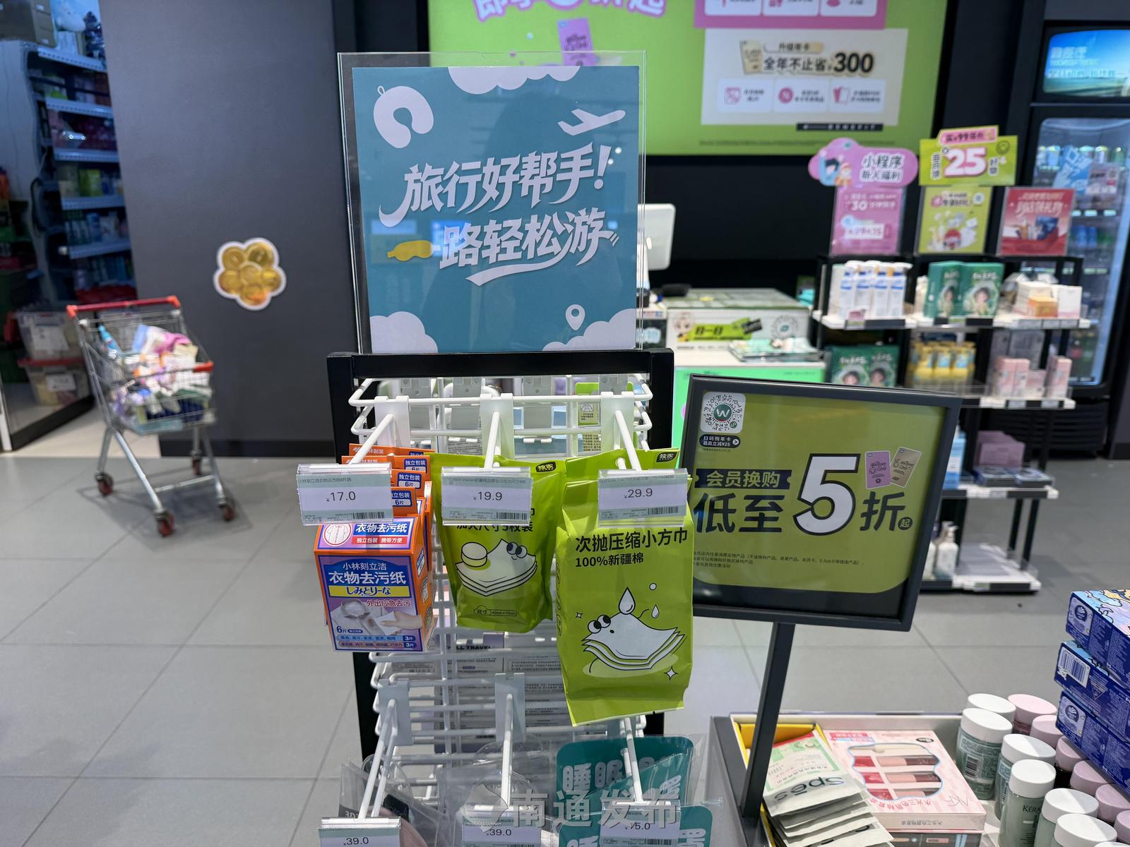随着消费者出行需求日益细分,旅游出行好物不断推陈出新。在南通CBD大有境屈臣氏门店,除了常见的一次性浴巾、次抛毛巾等,次抛泡澡袋等新兴品类也出现在旅行好物销售区,消除一些消费者外出旅行对酒店浴缸卫生状况的担忧。此外,具有“3C认证”的充电宝,也成为不少消费者的“刚需”。名创优品推出的一次性衣帽贴、便携折叠拖鞋、一次性干发帽、可视型蒸汽眼罩等,同样满足不同旅行者的消费需求。