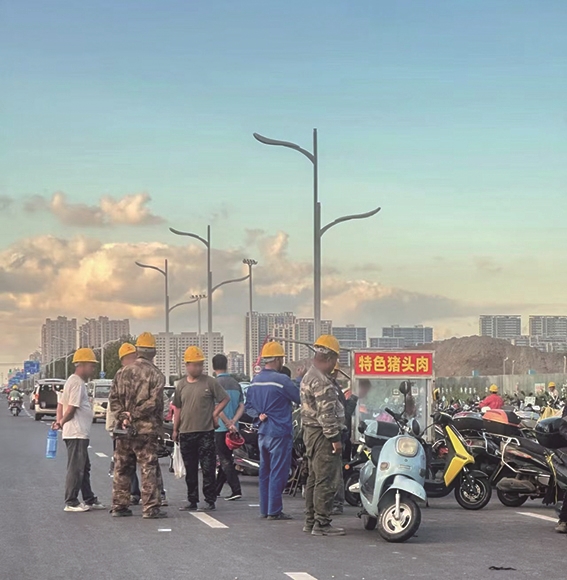 挂着“特色猪头肉”五个大字的移动摊位,这个时刻就是最可爱的“显眼包”。还没来得及取下安全帽的工人们,便陆陆续续围上。摊位还没有摆稳——想必这个猪头肉也是掐着点出锅再搬出来的,喷香,还带着热气。