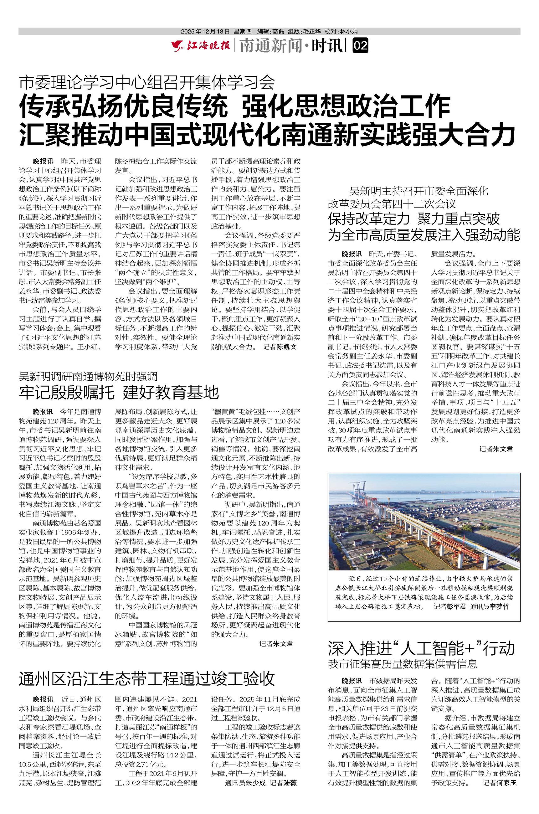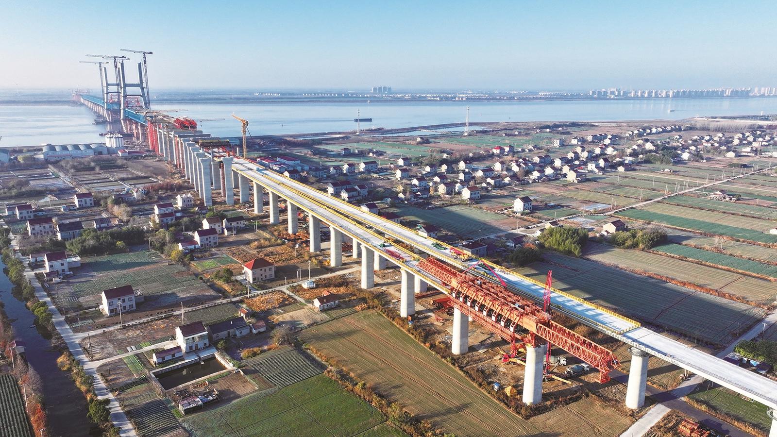 近日,经过10个小时的连续作业,由中铁大桥局承建的崇启公铁长江大桥北引桥城际侧最后一孔移动模架现浇梁顺利浇筑完成,标志着大桥下层铁路梁现浇施工任务圆满收官,为后续转入上层公路梁施工奠定基础。 记者彭军君 通讯员李梦竹