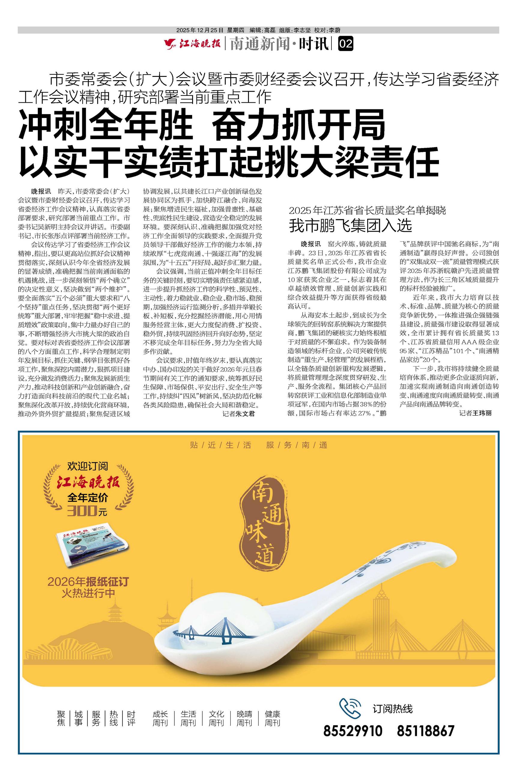 晚报讯 窑火淬炼,铸就质量丰碑。23日,2025年江苏省省长质量奖名单正式公布,我市企业江苏鹏飞集团股份有限公司成为10家获奖企业之一,标志着其在卓越绩效管理、质量创新实践和综合效益提升等方面获得省级最高认可。