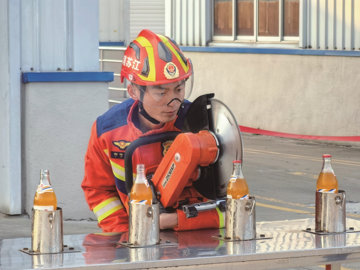 如东消防组织开展双轮异向切割锯拆装及使用训练。朱程程