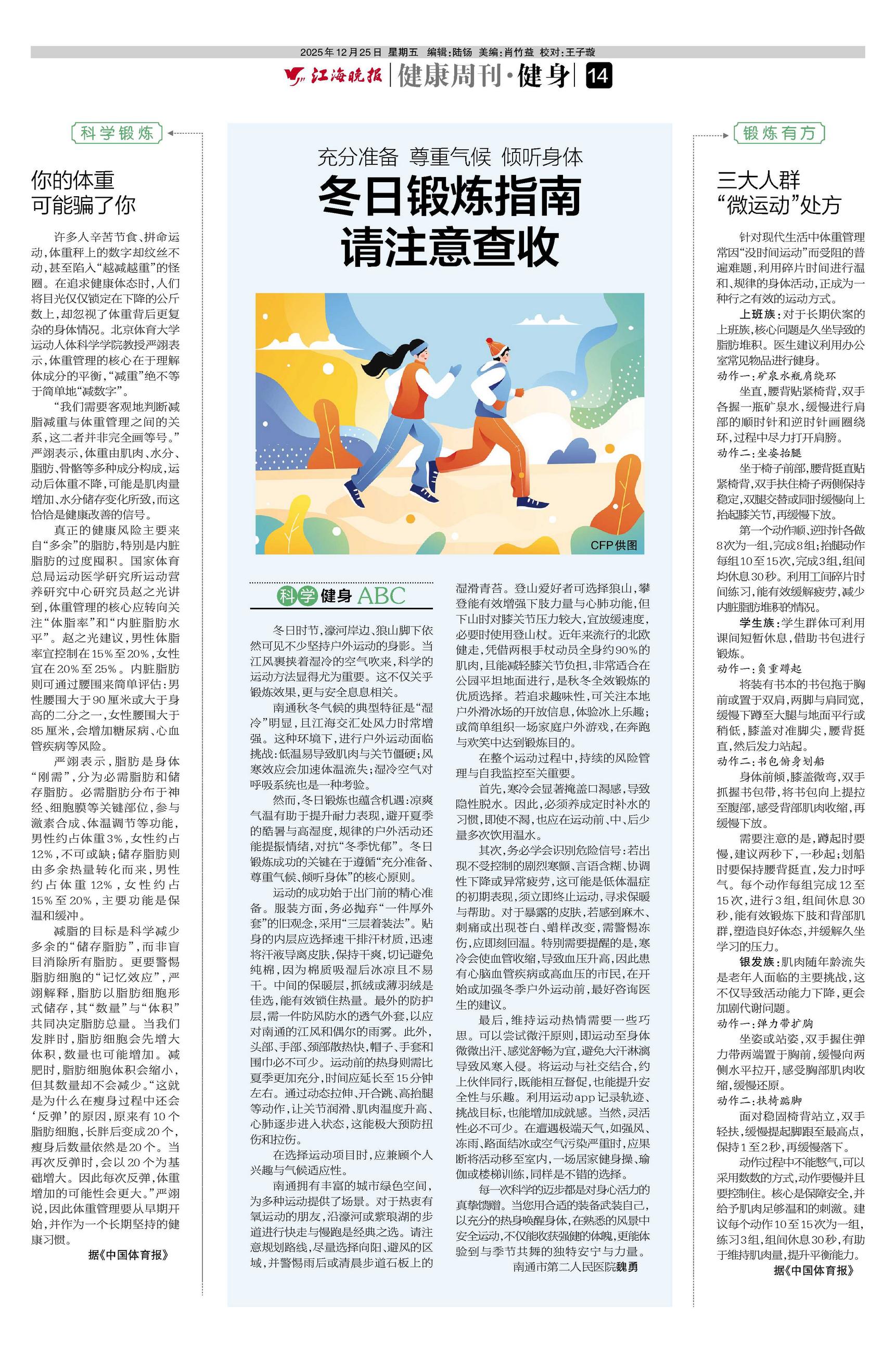“我们需要客观地判断减脂减重与体重管理之间的关系,这二者并非完全画等号。”严翊表示,体重由肌肉、水分、脂肪、骨骼等多种成分构成,运动后体重不降,可能是肌肉量增加、水分储存变化所致,而这恰恰是健康改善的信号。