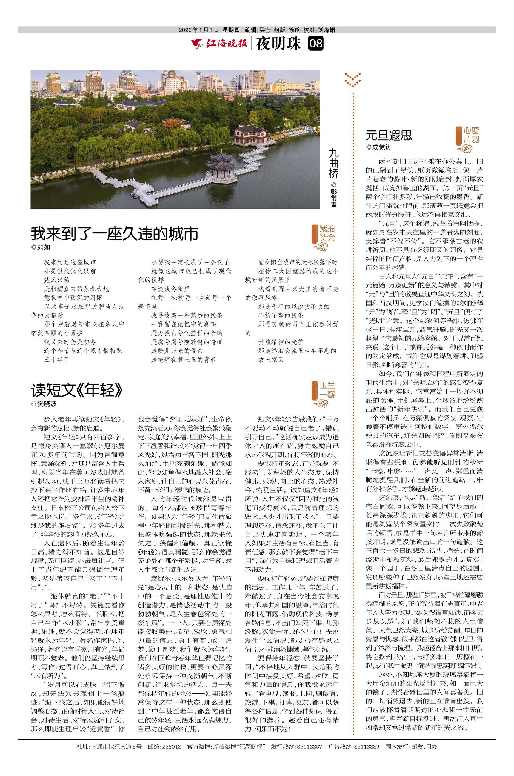两本新旧日历平摊在办公桌上。旧的已翻到了尽头,纸页微微卷起,像一片片苍老的落叶;新的刚刚启封,封面厚实挺括,似亮如碧玉的湖面。第一页“元旦”两个字粗壮多彩,洋溢出浓稠的墨香。新年的门槛就在眼前,那薄薄一页纸竟会把两段时光分隔开,永远不再相互交汇。