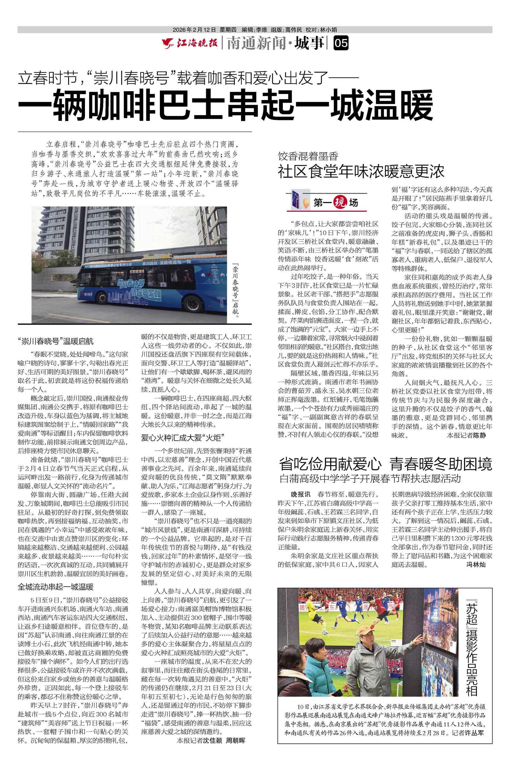 立春启程,“崇川春晓号”咖啡巴士先后驻点四个热门商圈,当咖香与墨香交织,“欢欢喜喜过大年”的前奏曲已然吹响;返乡高峰,“崇川春晓号”公益巴士在四大交通枢纽延伸免费接驳,为归乡游子、来通旅人打造温暖“第一站”;小年迎新,“崇川春晓号”奔赴一线,为城市守护者送上暖心物资、开放四个“温暖驿站”,致敬平凡岗位的不平凡……车轮滚滚,温暖不止。