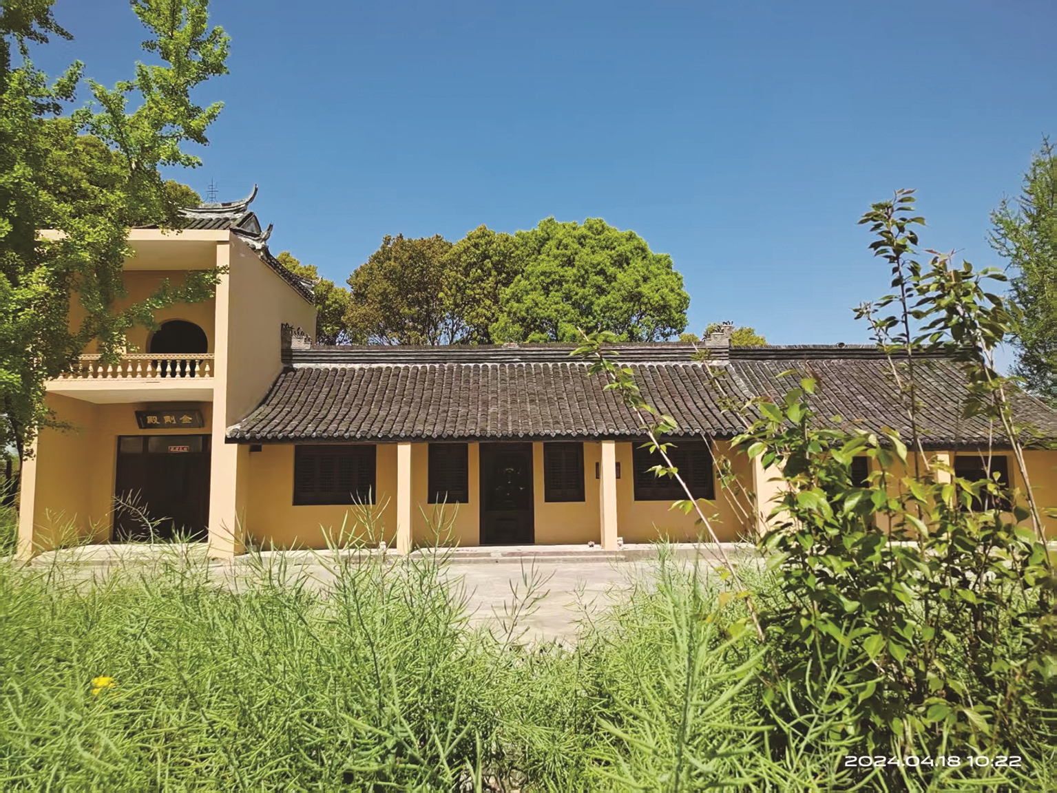 往前走,是范湖洲标志性古建筑遗存水竹庵(玉皇殿)、金刚殿。玉皇殿的木构架被考证为明末清初遗存,斗拱上玲珑的龙舟木雕,昭示着昔日匠人的精湛技艺。它历经变迁,清末曾改为学堂,1930年红十四军曾在此活动,新中国成立后先后作为南通市职业高中、范湖高中及初中校舍。草坪上的纱帽石是明代的遗存,也是先民抗倭的历史见证。