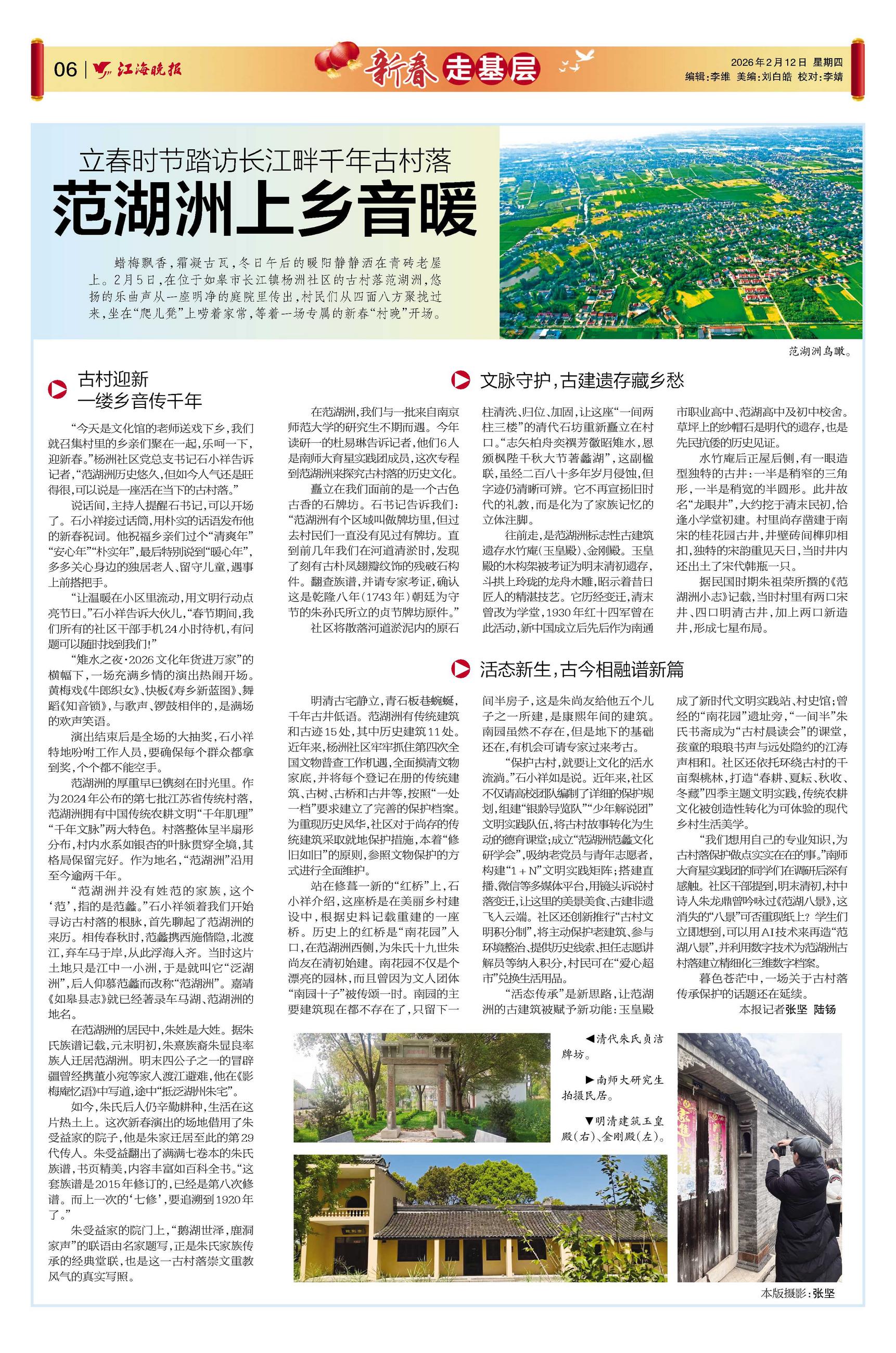 范湖洲的厚重早已镌刻在时光里。作为2024年公布的第七批江苏省传统村落,范湖洲拥有中国传统农耕文明“千年肌理”“千年文脉”两大特色。村落整体呈半扇形分布,村内水系如银杏的叶脉贯穿全境,其格局保留完好。作为地名,“范湖洲”沿用至今逾两千年。