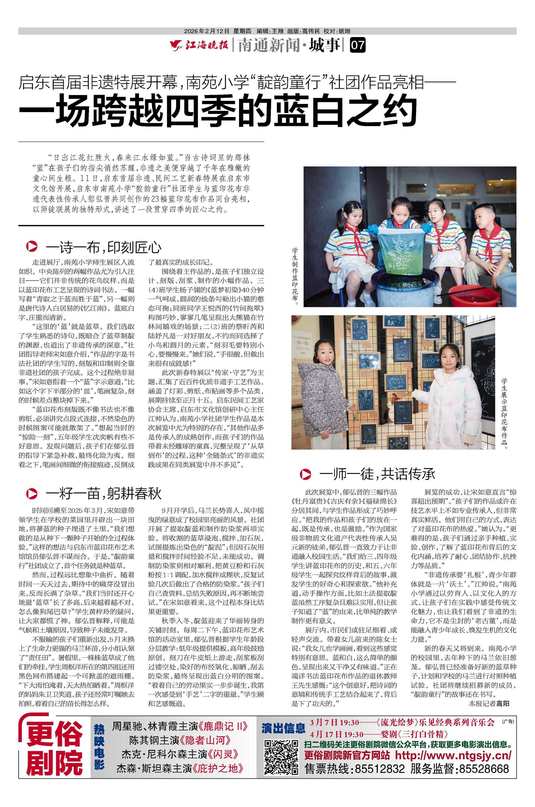 “日出江花红胜火,春来江水绿如蓝。”当古诗词里的那抹“蓝”在孩子们的指尖悄然苏醒,非遗之美便穿越了千年在稚嫩的童心间生根。11日,启东首届非遗、民间工艺新春特展在启东市文化馆开展,启东市南苑小学“靛韵童行”社团学生与蓝印花布非遗代表性传承人郁弘晋共同创作的23幅蓝印花布作品同台亮相,以师徒联展的独特形式,讲述了一段贯穿四季的匠心之约。
