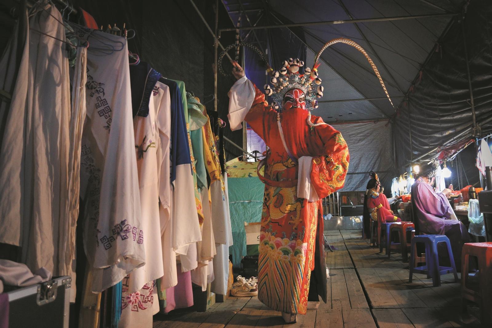 南国粤剧团演员在后台进行演出前练习。