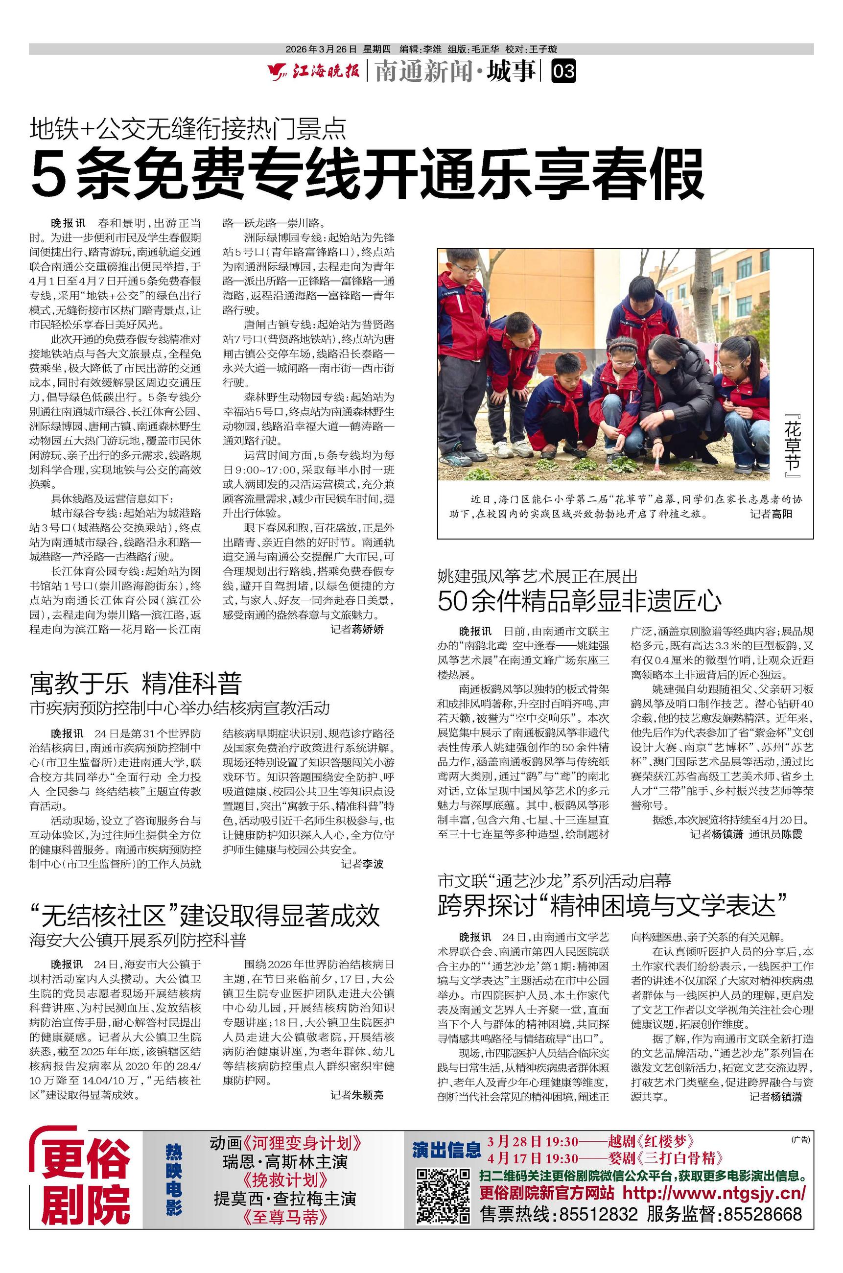 晚报讯 春和景明,出游正当时。为进一步便利市民及学生春假期间便捷出行、踏青游玩,南通轨道交通联合南通公交重磅推出便民举措,于4月1日至4月7日开通5条免费春假专线,采用“地铁+公交”的绿色出行模式,无缝衔接市区热门踏青景点,让市民轻松乐享春日美好风光。