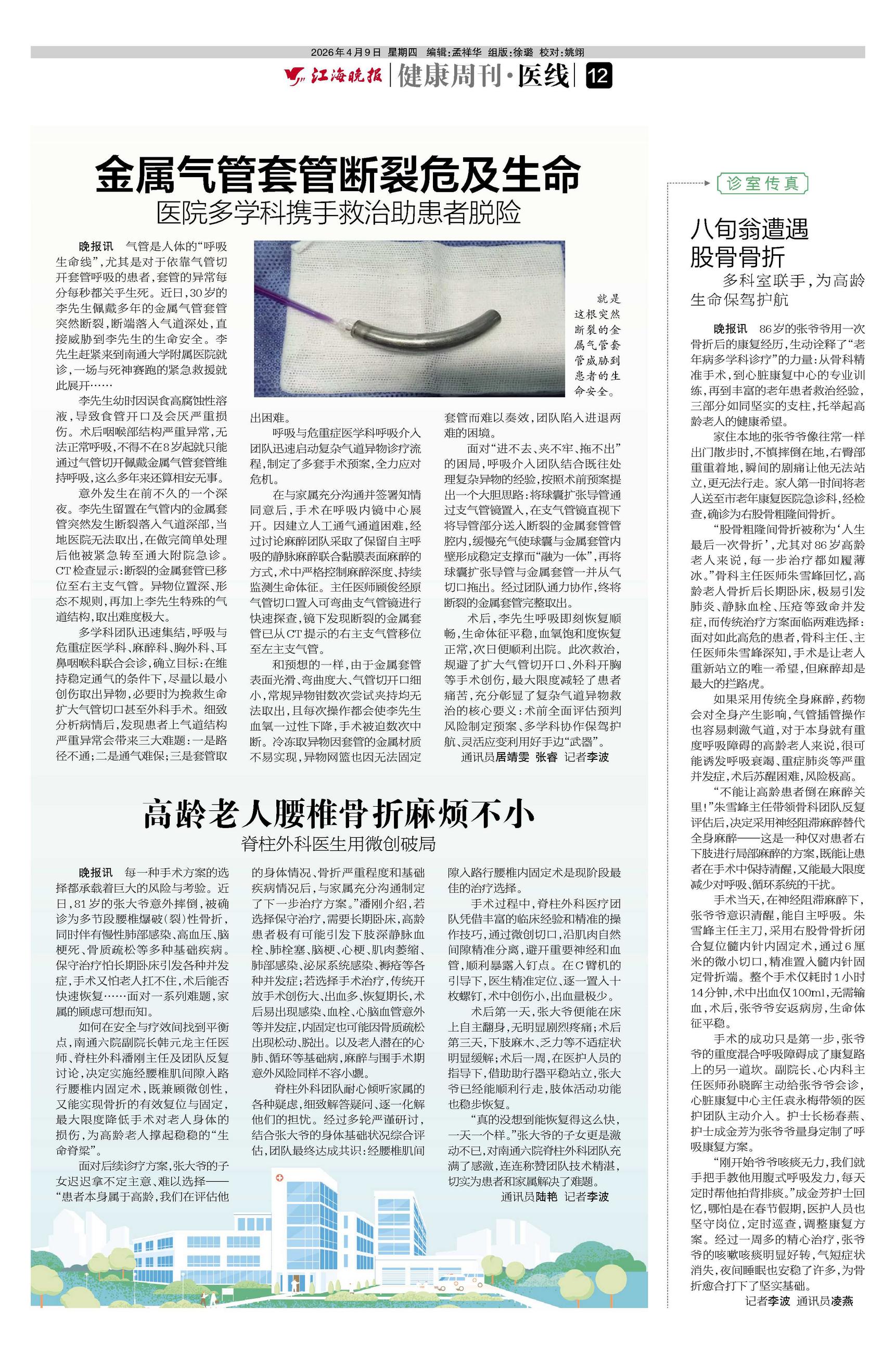 晚报讯 每一种手术方案的选择都承载着巨大的风险与考验。近日,81岁的张大爷意外摔倒,被确诊为多节段腰椎爆破(裂)性骨折,同时伴有慢性肺部感染、高血压、脑梗死、骨质疏松等多种基础疾病。保守治疗怕长期卧床引发各种并发症,手术又怕老人扛不住,术后能否快速恢复……面对一系列难题,家属的顾虑可想而知。