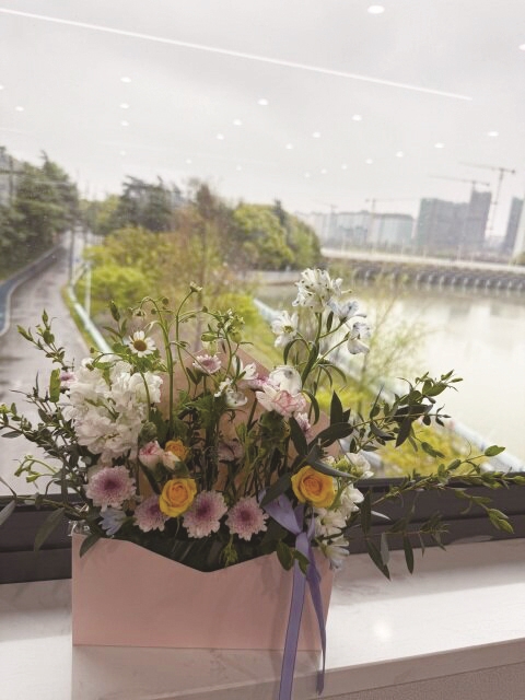 原来是把鲜花插进信封造型的包装里,像一封写满春日浪漫的信。你看,黄玫瑰舒展着可爱的花瓣,带着暖暖的光;粉紫的小菊完全绽放它的身姿;还有可爱的雏菊……好像要把一整个春天的色彩都藏进这片小小的天地。