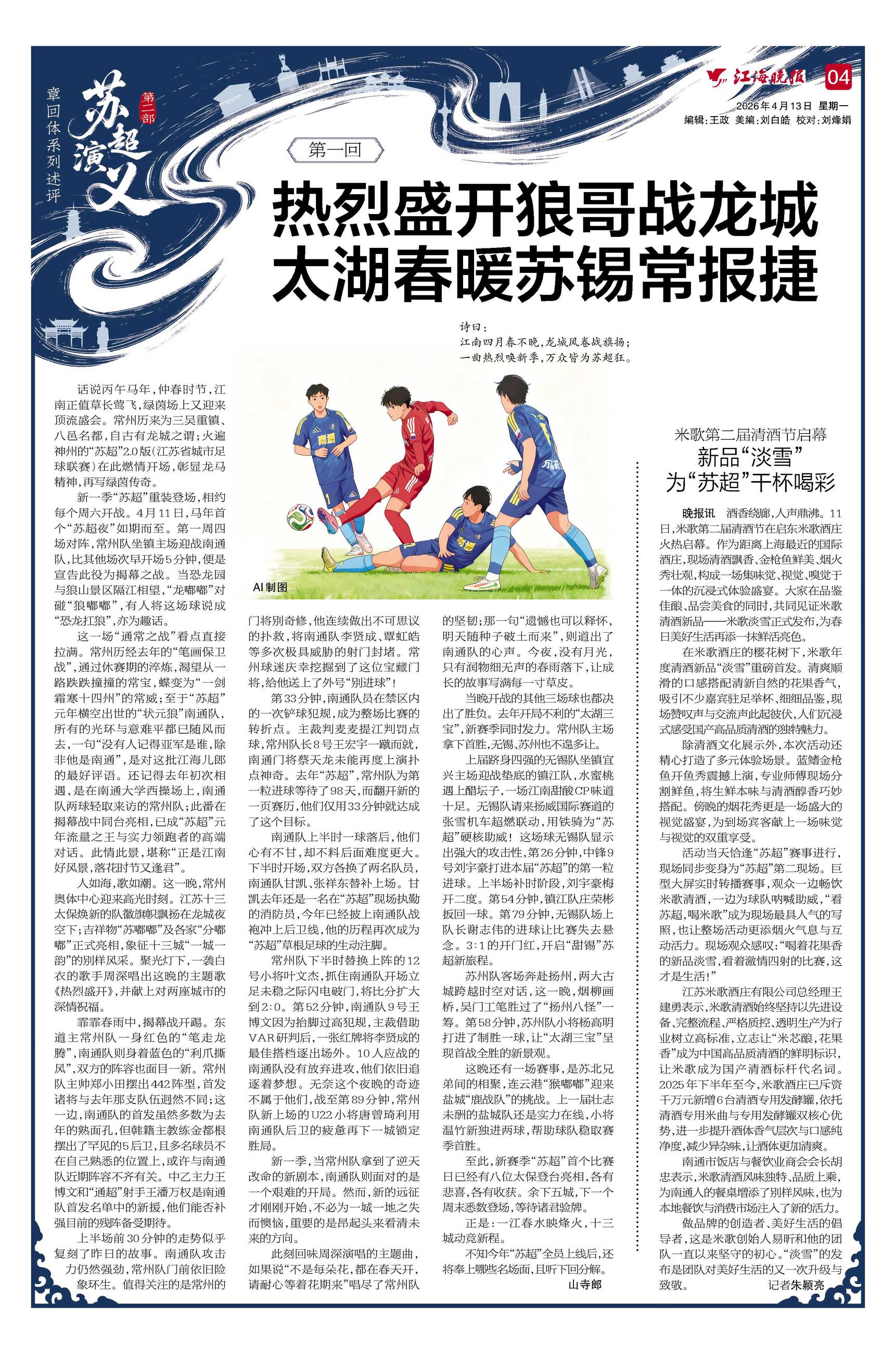 话说丙午马年,仲春时节,江南正值草长莺飞,绿茵场上又迎来顶流盛会。常州历来为三吴重镇、八邑名都,自古有龙城之谓;火遍神州的“苏超”2.0版(江苏省城市足球联赛)在此燃情开场,彰显龙马精神,再写绿茵传奇。