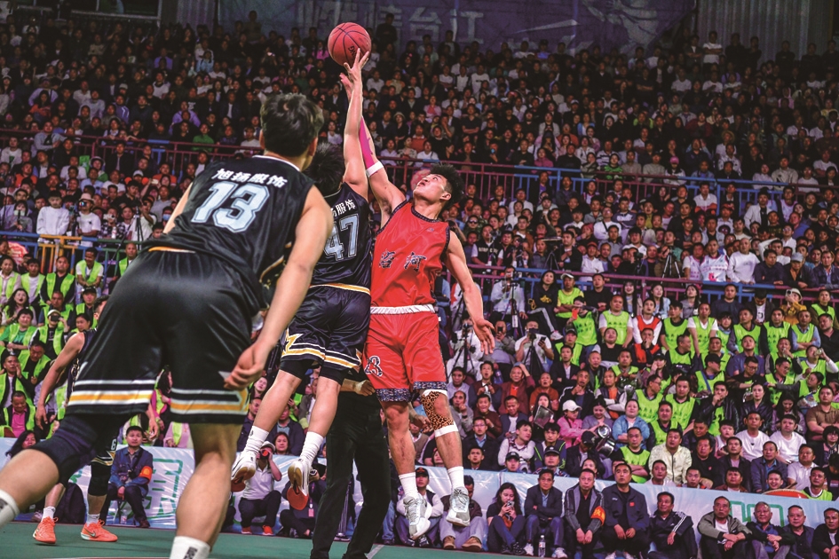 4月11日,沿河队球员田义(右)与凯里队球员吴家彬在比赛中跳球。当晚,在贵州省黔东南苗族侗族自治州台江县台盘乡举行的贵州省第四届“美丽乡村”篮球联赛(贵州“村BA”)总决赛中,凯里市代表队77比62战胜沿河县代表队,夺得冠军。 新华社发