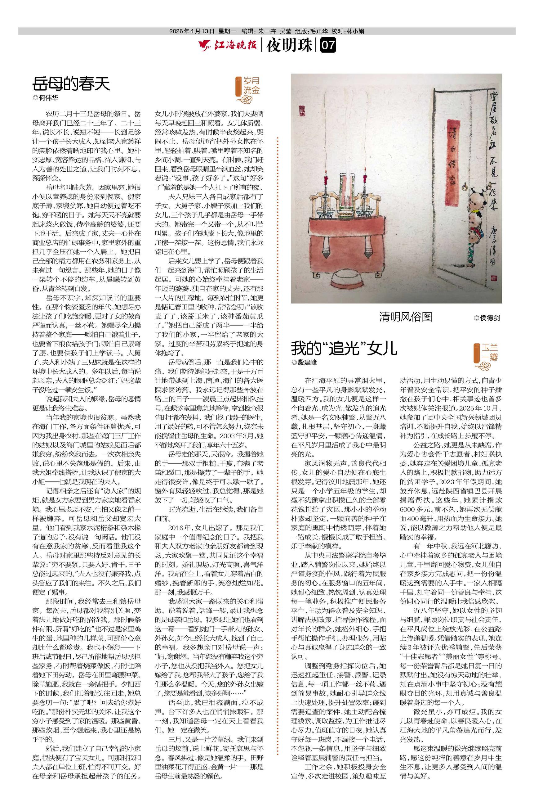 婚后,我们建立了自己幸福的小家庭,很快便有了宝贝女儿。可那时我和夫人都在单位上班,忙得不可开交。好在母亲和岳母承担起带孩子的任务。女儿小时候被放在外婆家,我们夫妻俩每天早晚赶回三和照看。女儿体质弱,经常咳嗽发热,有时候半夜烧起来,哭闹不止。岳母便通宵把外孙女抱在怀里,轻轻拍着、哄着,嘴里哼着不知名的乡间小调,一直到天亮。有时候,我们赶回来,看到岳母眼睛里布满血丝,她却笑着说:“没事,孩子好多了。”这句“好多了”藏着的是她一个人扛下了所有的夜。