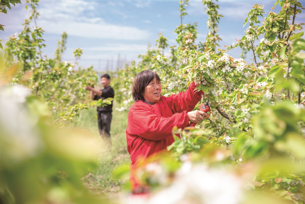 ◀4月9日,通州区东社镇五马路村的果园内,农民正忙着修剪梨树枝条,田间地头一派繁忙。翟慧勇