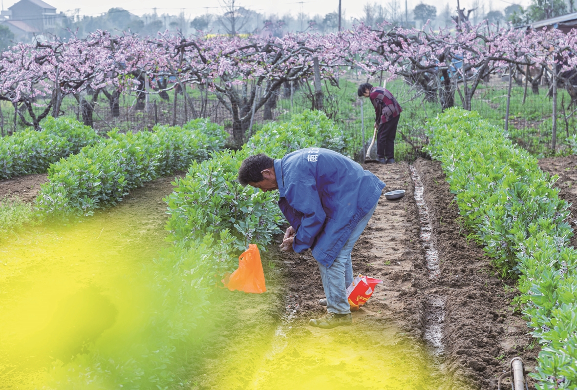 4月1日,海门双桥村开心果园桃花争艳,一对农民夫妇正在播种玉米,绘就一幅优美的农耕画卷。宋武斌