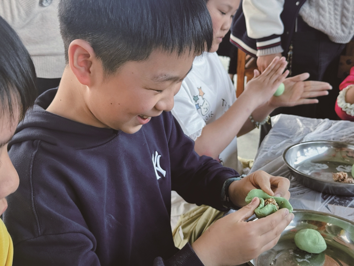 在大地厨房,青团制作体验开启。大家有序洗手、围坐桌边,领到了沉甸甸的材料包——拌好艾草汁的糯米团、香甜的花生馅与豆沙馅。在工作人员的细致讲解下,小记者们认真学习制作步骤,从揉面团到包馅料、搓圆团,笨拙的动作渐渐变得娴熟。圆的、扁的、小巧玲珑的、憨态可掬的,每一个青团都承载着孩子们的童真与巧思。