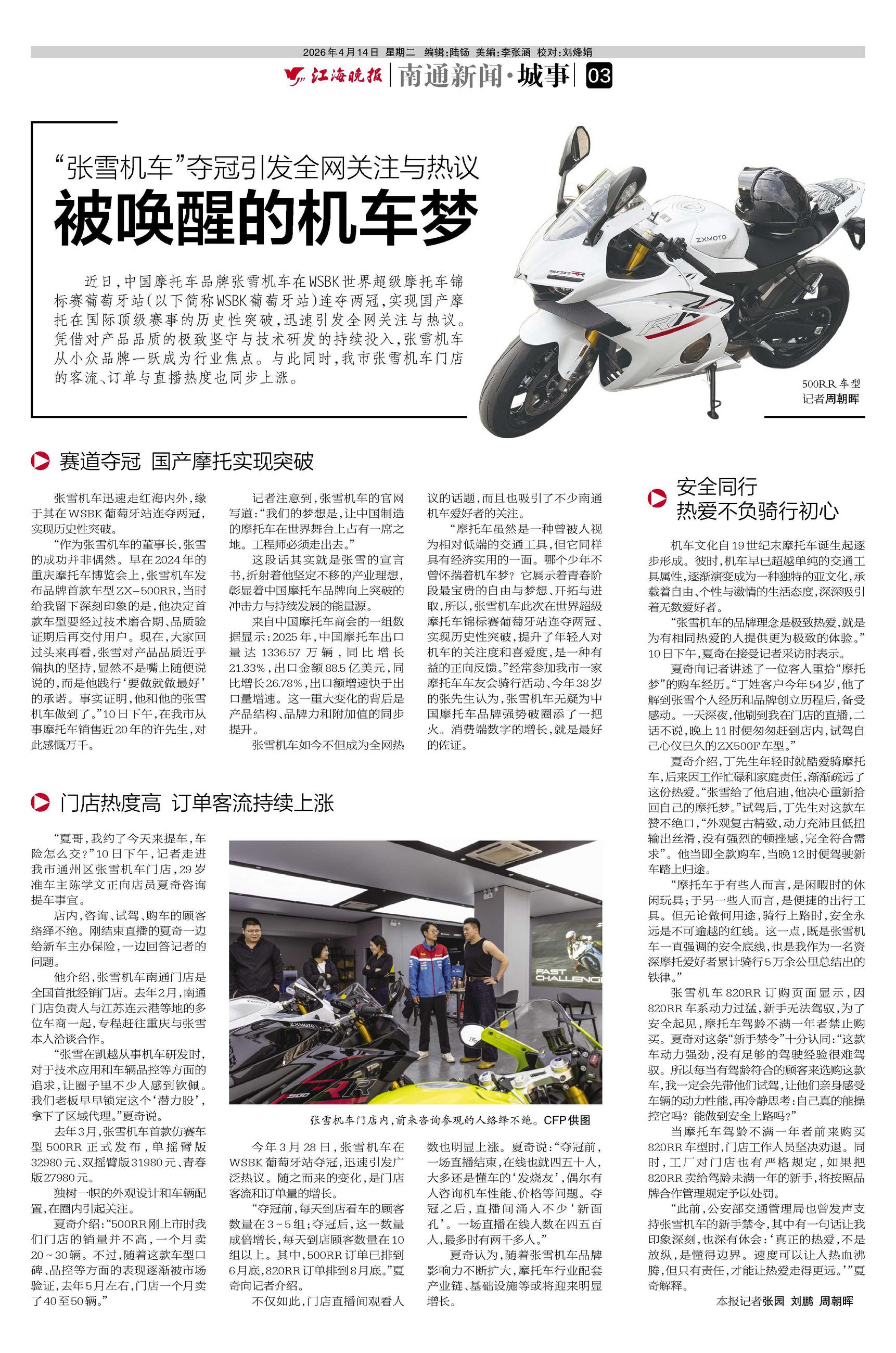 夏奇向记者讲述了一位客人重拾“摩托梦”的购车经历。“丁姓客户今年54岁,他了解到张雪个人经历和品牌创立历程后,备受感动。一天深夜,他刷到我在门店的直播,二话不说,晚上11时便匆匆赶到店内,试驾自己心仪已久的ZX500F车型。”