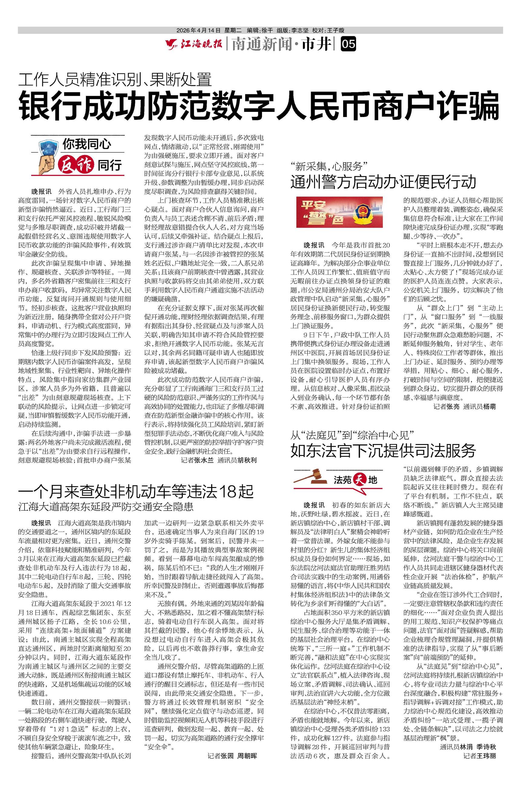晚报讯 外省人员扎堆申办、行为高度雷同,一场针对数字人民币商户的新型诈骗悄然逼近。近日,工行海门三和支行依托严密风控流程、敏锐风险嗅觉与多维尽职调查,成功识破并堵截一起假借经营名义、意图违规使用数字人民币收款功能的诈骗风险事件,有效筑牢金融安全防线。