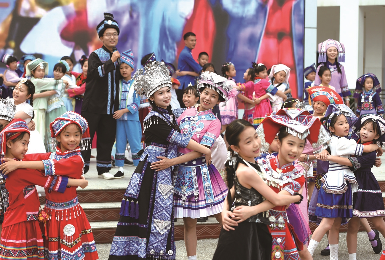 4月13日,广西南宁市滨湖路小学教育集团滨湖校区,学校师生在表演节目。当日,广西南宁市滨湖路小学教育集团滨湖校区举行“情系‘三月三’ 同心向未来”主题活动,全校师生欢聚一堂,载歌载舞,喜迎传统节日“三月三”。新华社发
