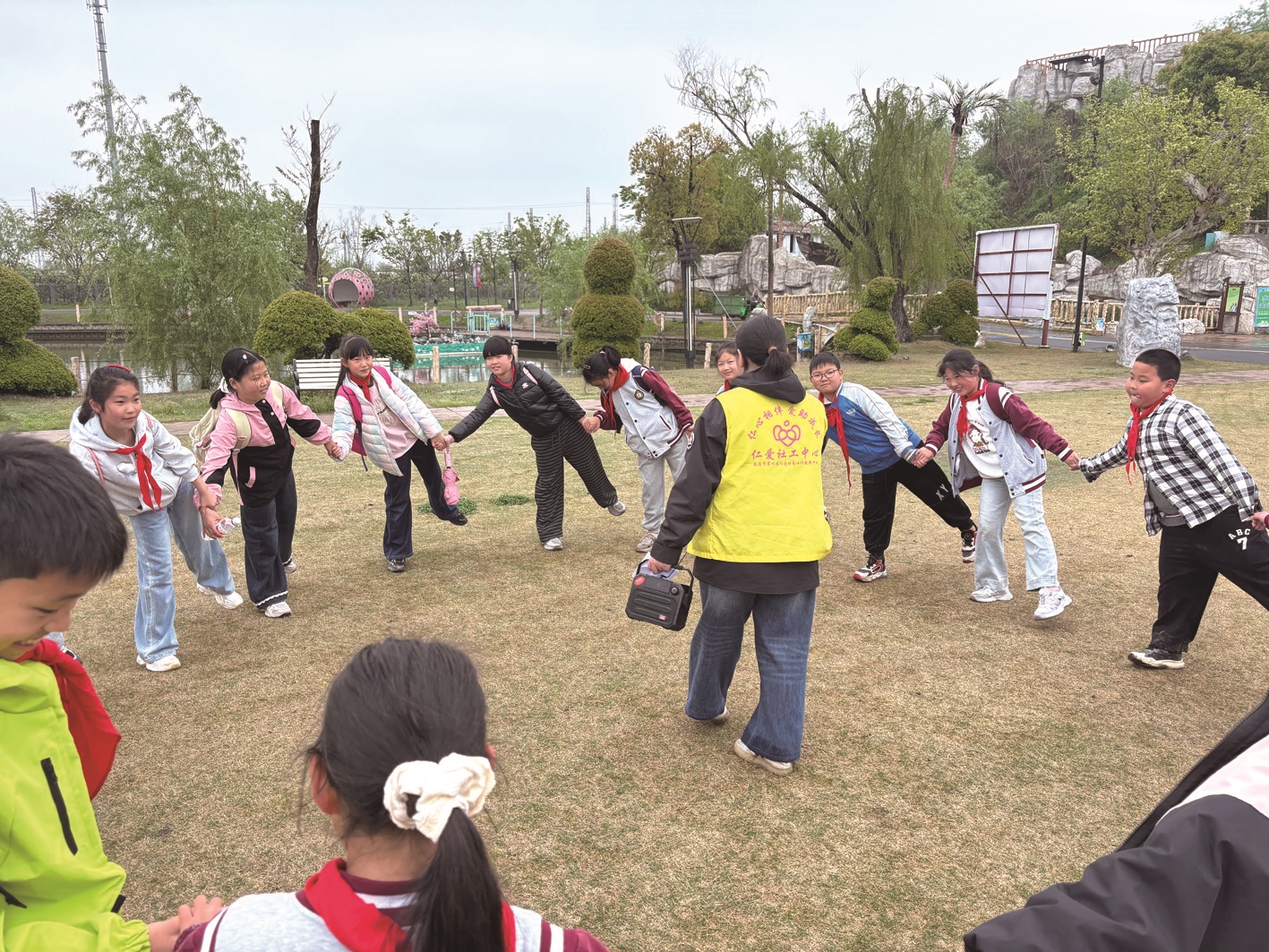 晚报讯 13日上午,南通市虹桥小学联合崇川区仁爱社会工作发展中心在奇妙农场开展“童伴共乐赴春光,自然同行伴成长”春游特色户外拓展主题活动。在学校老师与社工姐姐的陪伴下,孩子们结伴而行,在自然中嬉戏、在互动中成长,将欢声笑语留在了春日的草地上。