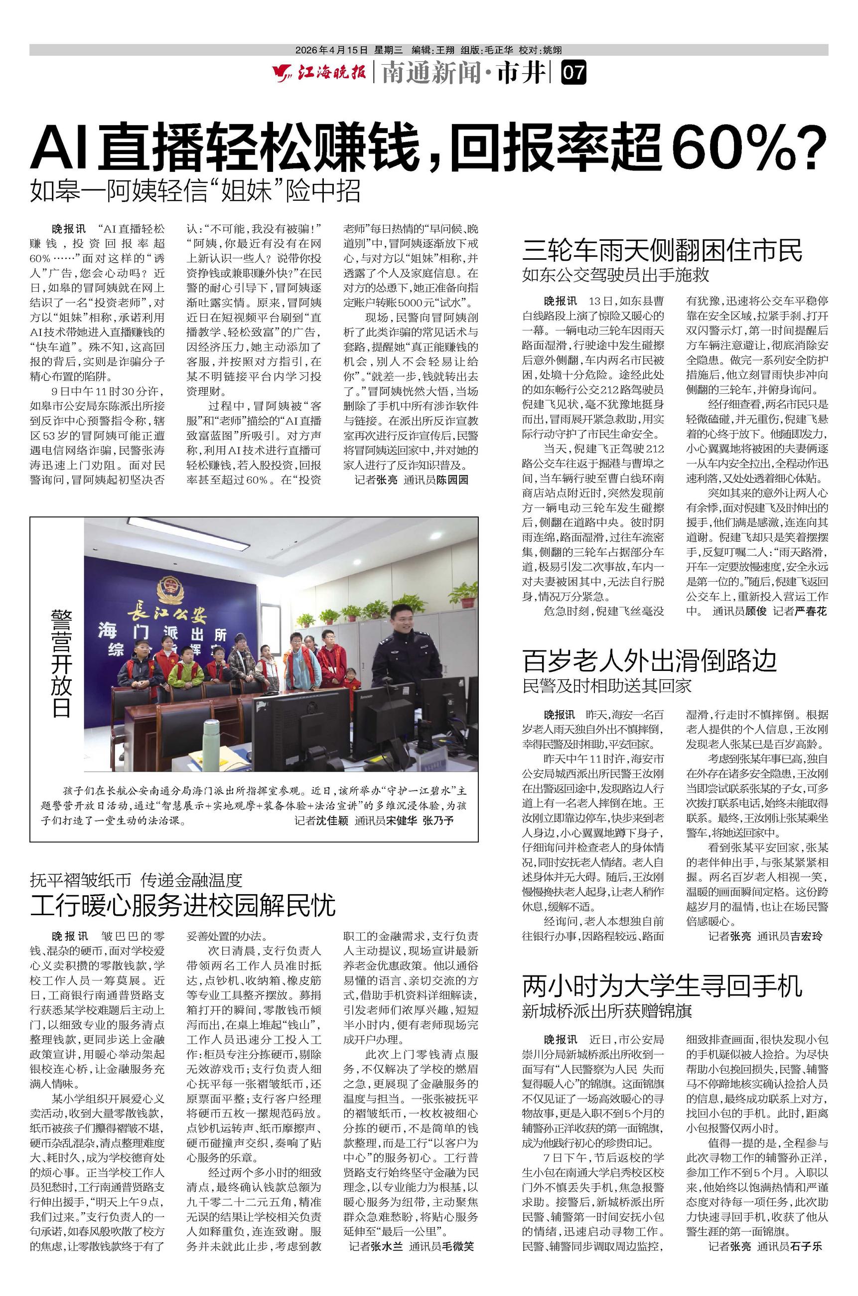 突如其来的意外让两人心有余悸,面对倪建飞及时伸出的援手,他们满是感激,连连向其道谢。倪建飞却只是笑着摆摆手,反复叮嘱二人:“雨天路滑,开车一定要放慢速度,安全永远是第一位的。”随后,倪建飞返回公交车上,重新投入营运工作中。 通讯员顾俊 记者严春花